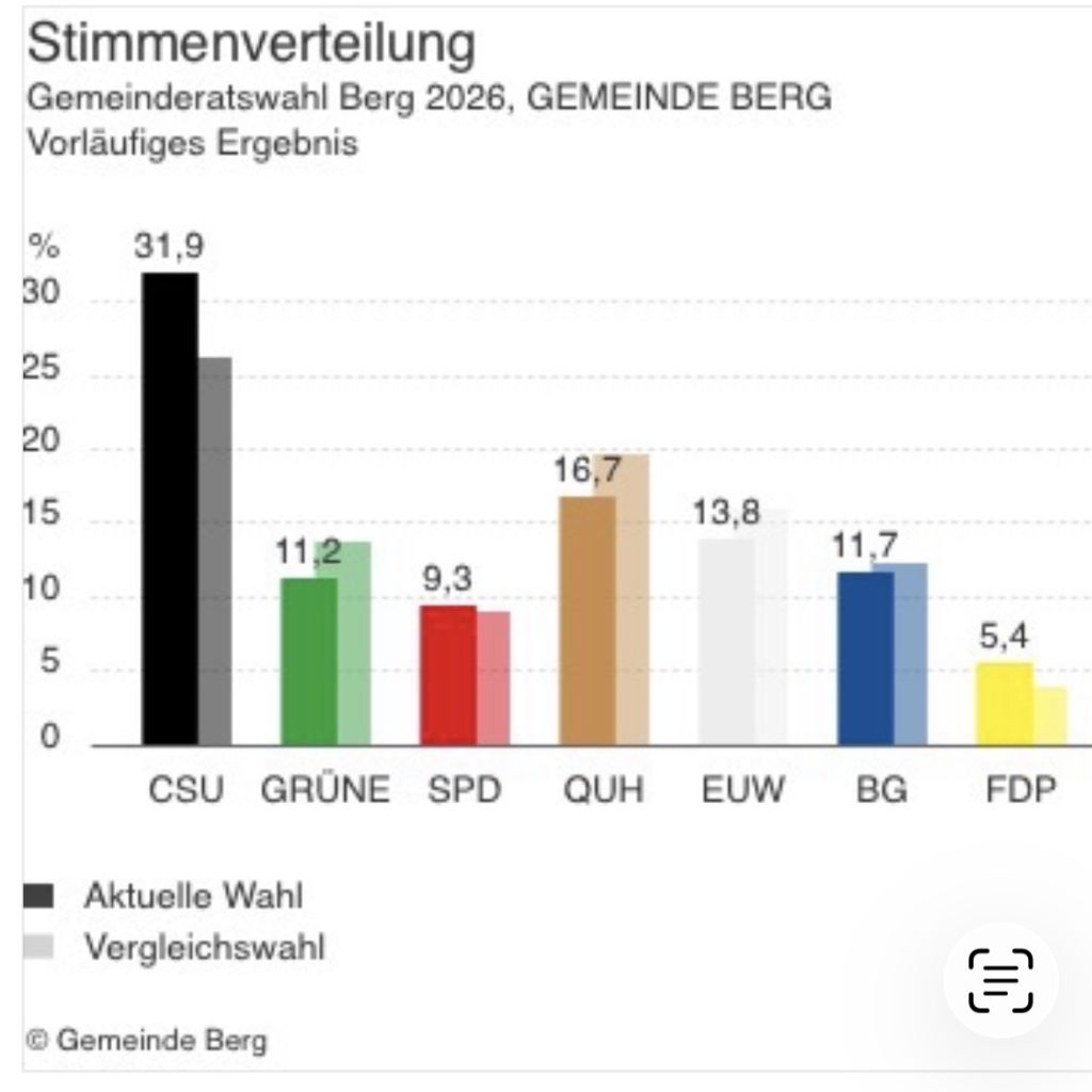 Die detaillierten Ergebnisse gibts hier: https://www.gemeinde-berg.de/kommunalwahl-2026-wahlergebnisse